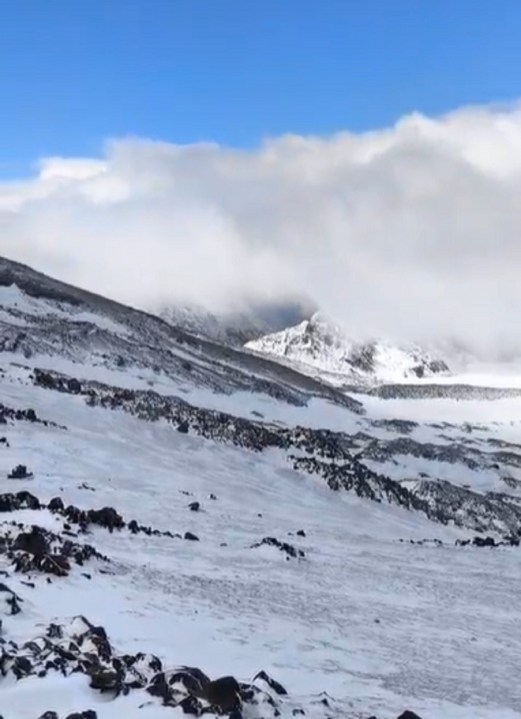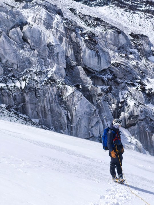 Se abrió como una ventana de buen clima. Así que nos dejó poder trabajar un poco más», continúo su relato. Subieron a los 2800 metros, «una zona mucho más técnica, con presencia de glaciares y grietas», que requirió el uso de cuerdas y arneses para avanzar de forma segura.