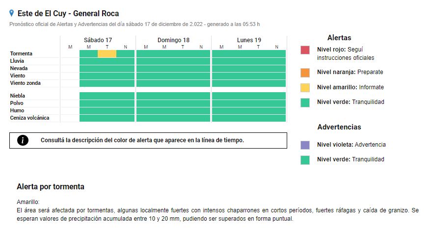 La misma advertencia se emitió para la provincia de Río Negro, en las zona de Avellaneda, Pichi Mahuida, este de El Cuy y General Roca.