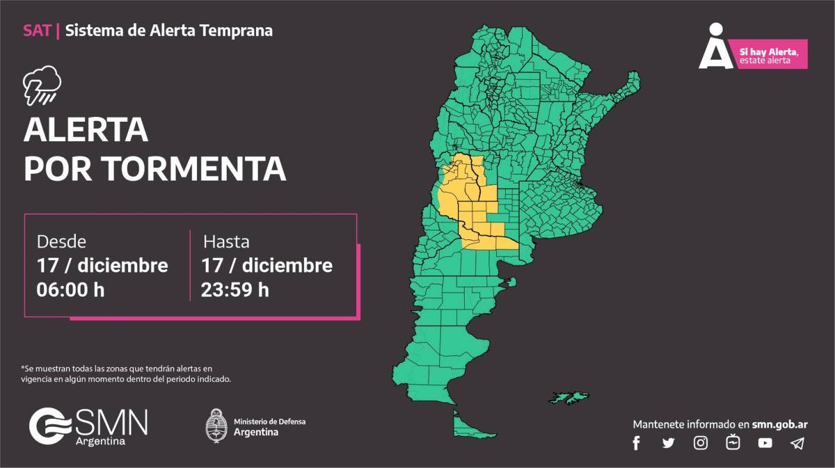 El Servicio Meteorológico Nacional (SMN) emitió hoy una alerta amarilla por tormentas para sectores de las provincias de Mendoza, San Luis, La Pampa y Río Negro. Las horas de la tarde serían el momento de mayor probabilidad en nuestra región.