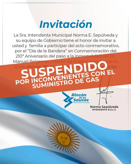 Debido al inconveniente con el suministro de gas, la municipalidad de Rincón de los Sauces informó que el acto programado para este viernes 20 de junio en conmemoración por el Día de la Bandera quedó suspendido.