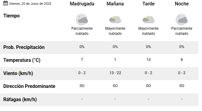 Para este viernes 20 junio, el Servicio Meteorológico Nacional (SMN) indicó que por la mañana la temperatura será de 1°C y con viento desde el sudoeste a velocidades entre 13 y 22 km/h. La máxima para hoy es de 13° C.