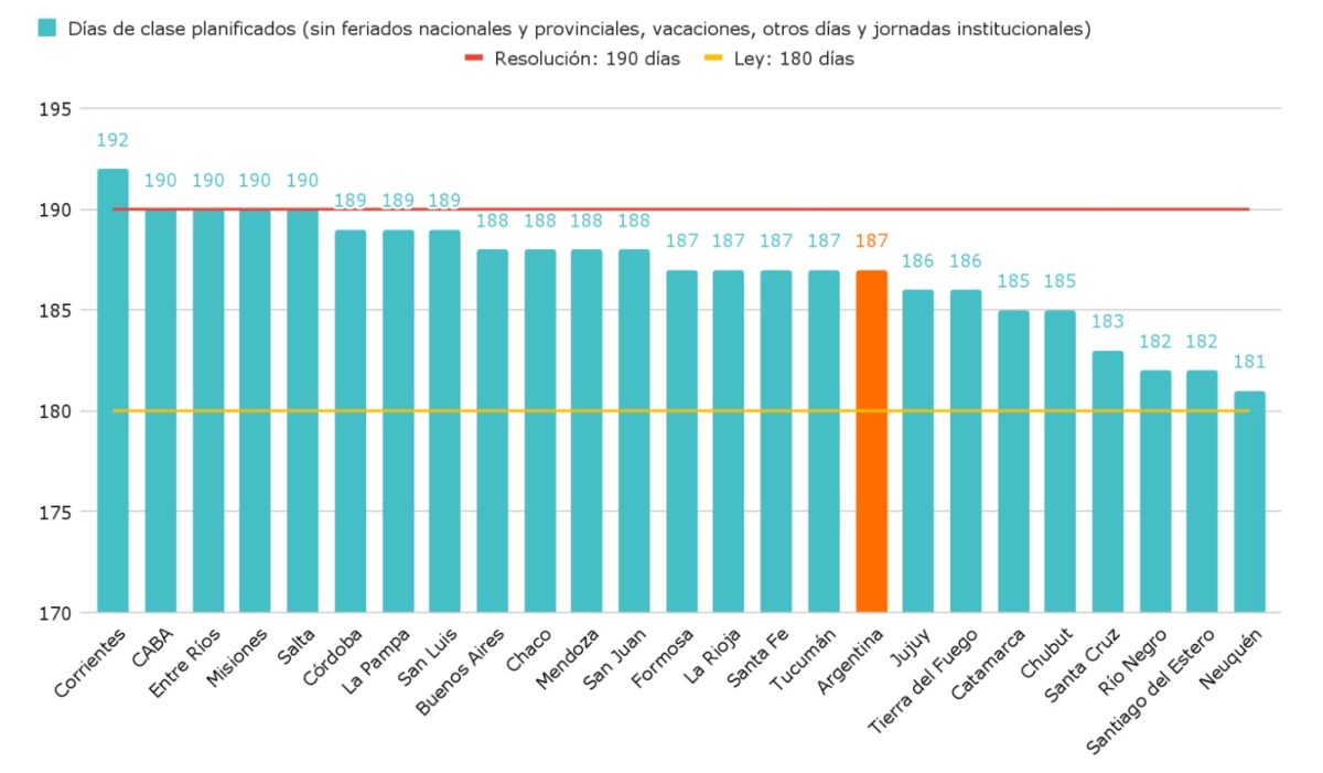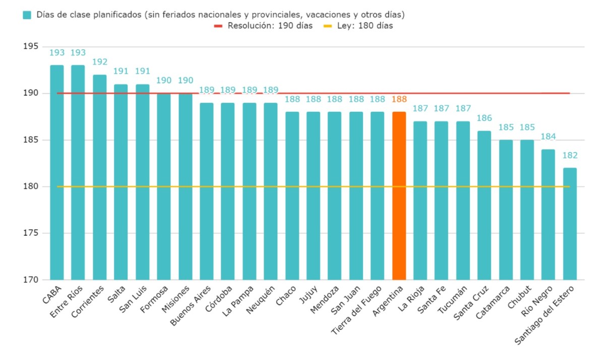 Según el primer escenario, son siete las jurisdicciones que tienen al menos 190 días de clase: Ciudad Autónoma de Buenos Aires (193), Entre Ríos (193), Corrientes (192), Salta (191), San Luis (191), Formosa (190) y Misiones (190). Sin embargo, la lista se reduce a cinco jurisdicciones (Corrientes, CABA, Entre Ríos, Misiones y Salta) cuando se toman en cuenta las jornadas institucionales.