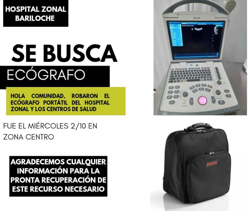El hospital de Bariloche inició un llamado a la comunidad para recuperar un ecógrafo portátil, que fue robado del baúl de un vehículo mientras una médica realizaba su trabajo en un centro se salud. «En el mercado informal no es vendible», indicaron.