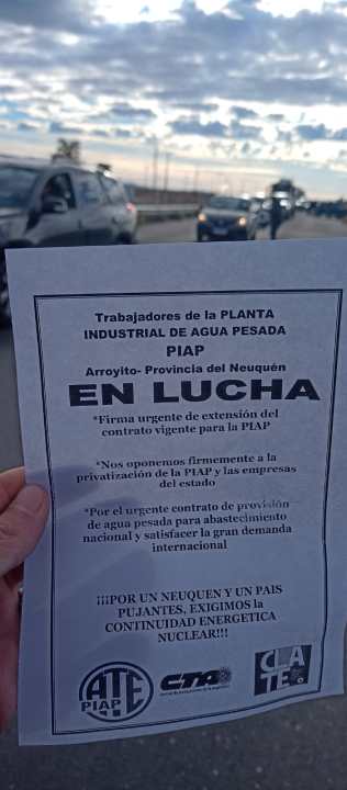 Los trabajadores de la Planta Industrial de Agua Pesada (PIAP) de Neuquén, realizaron una protesta en la Ruta 22 cerca de Arroyito este miércoles 16 de abril. Se trató de una volanteada que demoró el tránsito en el inicio del fin de semana largo de Semana Santa. Al mediodía levantaron la protesta, pero el lunes harán una nueva asamblea y podrían retomar la manifestación.