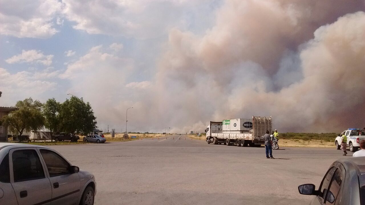 La poca visibilidad y el riesgo provocados por incendios de pastizales en provincia de La Pampa, a la altura de La Adela, motivaron que este mediodía se interrumpiera el tránsito en las afueras de Río Colorado.