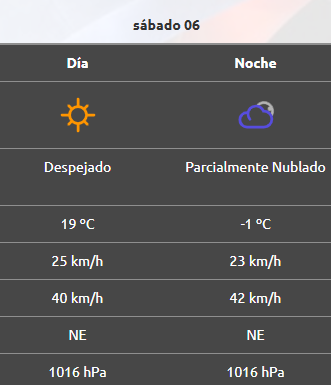 En General Roca y alrededores también se espera una tarde despejada, con casi 20°C de máxima, y viento del noreste a 25 km/h, con ráfagas a 40 km/h. Por la noche la mínima también será de -1°C y el viento se mantendrá al igual que en la tarde.