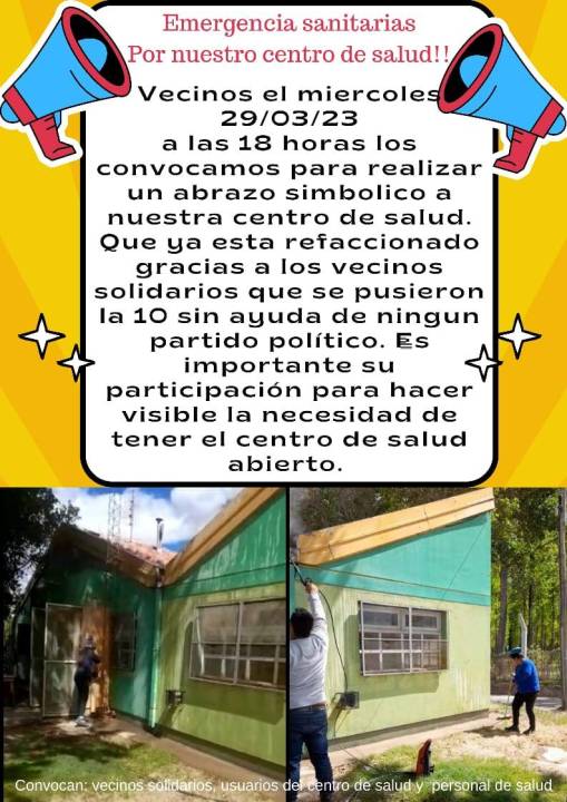 Los vecinos organizaron un abrazo simbólico para este miércoles 29 de marzo, a las 18. “Convocamos para realizar un abrazo simbólico a nuestro centro de salud. Ya está refaccionado gracias a los vecinos, sin ayuda de ningún partido político” expresaron.