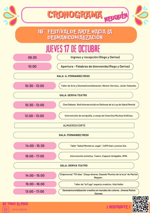 El Festival se realizará en forma simultánea en dos salas de Neuquén en el horario de 9: 30 a 17h. La sala de arte Fernández Rego y el Teatro Deriva abrirán sus puertas a los distintos talleres que se llevarán a cabo por integrantes de dispositivos de salud mental y trabajadorxs del sistema público de salud.