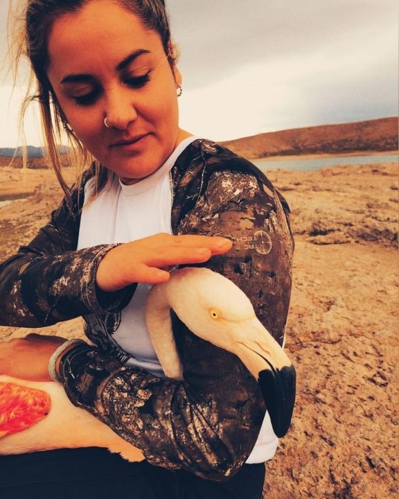 «En ese momento me metí al agua, que en esa zona es totalmente barro y el flamenco se dejó tomar sin problemas como sabiendo que yo no le quería hacer daño», contó la joven nacida en Chos Malal. Allí, desde la seguridad de la orilla estuvo más de media hora cortando las tanzas que atrapaban el cuerpo del ave.