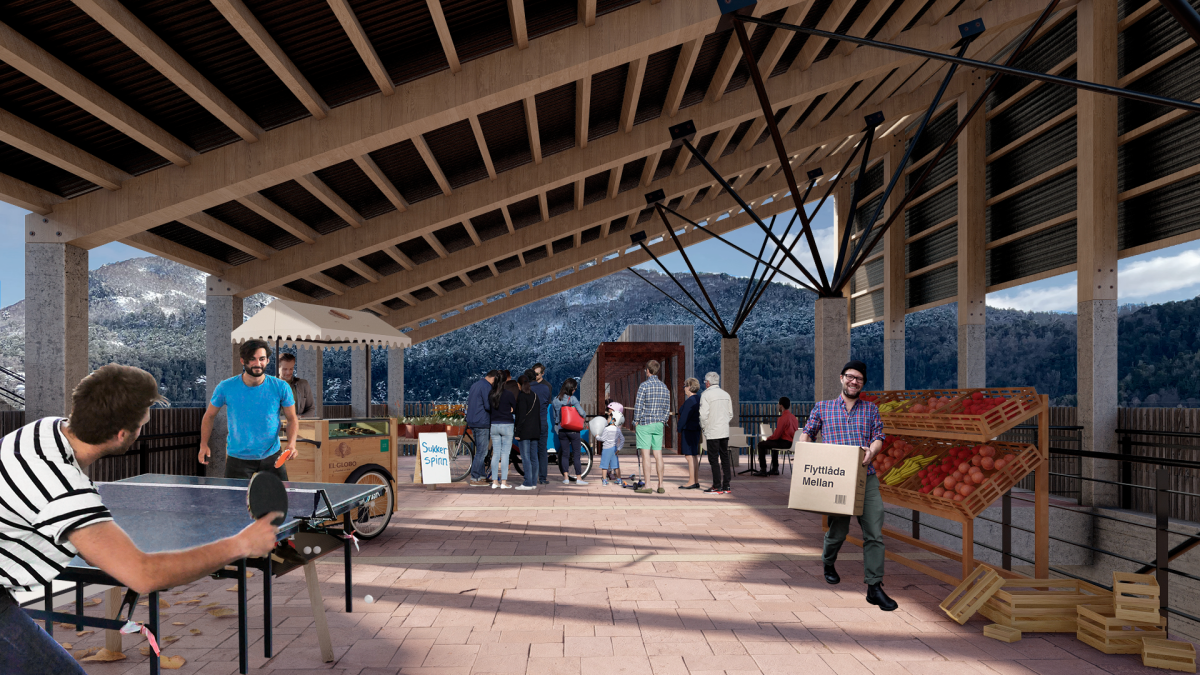 La estructura semicubierta se extiende como una galería a lo largo de la plaza, conserva y enmarca las perspectivas hacia el valle sin construir límites. Tiene el objetivo dotar al barrio Cantera de espacios para usos sociales, culturales, deportivos, ferias semanales, juegos y actividades para niños y también articular a la población de ambos sectores de la ciudad.