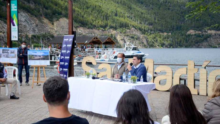El gobernador Omar Gutiérrez y el intendente de San Martín de los Andes, Carlos Saloniti ofrecieron esta mañana una conferencia de prensa en la costanera del lago Lácar. Allí se dio a conocer que el nuevo hospital estará finalizado y funcionará el 23 de septiembre. Además, presentó un convenio que establecerá cuáles serán proyectos para la modificación de la Costanera del Lago Lácar.