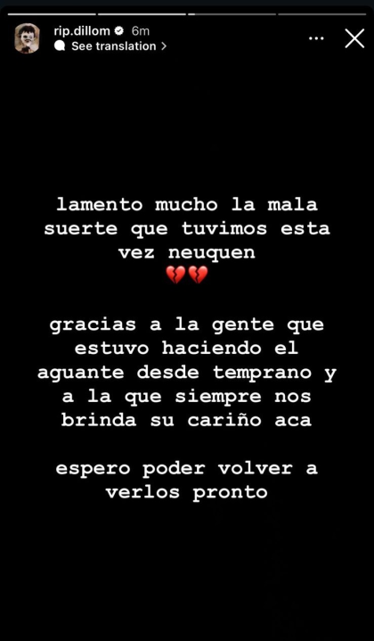 Dillom también se contactó con sus fanáticos vía Instagram y lamentó mucho la «mala suerte» que tuvieron este domingo, en la que iba a ser su segunda presentación en la Fiesta de la Confluencia y la cuarta vez en la ciudad.