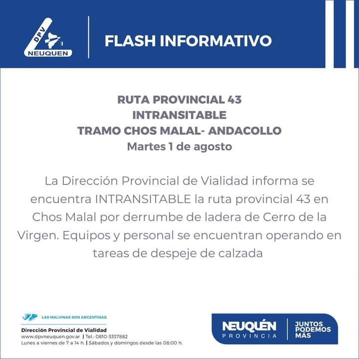 «Una vez que se pasa el segundo puente sobre el río Curi Leuvú, saliendo desde Chos Malal, sale un camino hacía la izquierda, para todos aquellos que deban continuar hasta Andacollo y otras localidades del norte», precisó.