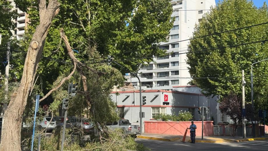 Un tronco de importantes dimensiones se desprendió de un árbol en el centro de Neuquén y generó complicaciones en el tránsito. Las autoridades restringen el concurrido acceso para despejar la zona.