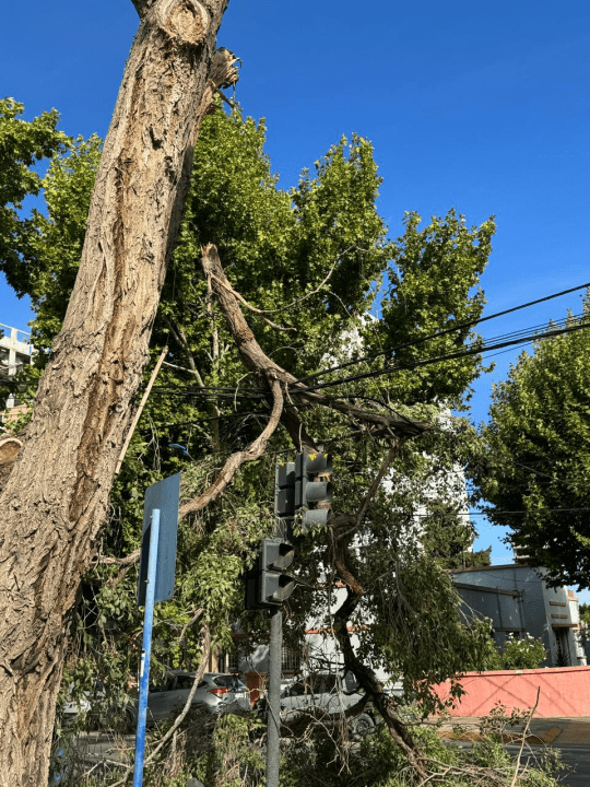 El hecho sucedió en la intersección de las calles Belgrano y La Rioja, en donde -por razones que aún no están establecidas- una rama de importantes dimensiones quedó arriba del tendido eléctrico, cerca de un semáforo.