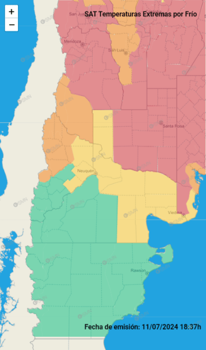 Por otra parte en Río Negro, el pronóstico por mínimas más intensas que lo habitual se extendió hacia el este, ya que además de General Roca y El Cuy, abarca ahora también a Avellaneda, Pichi Mahuida y Conesa.