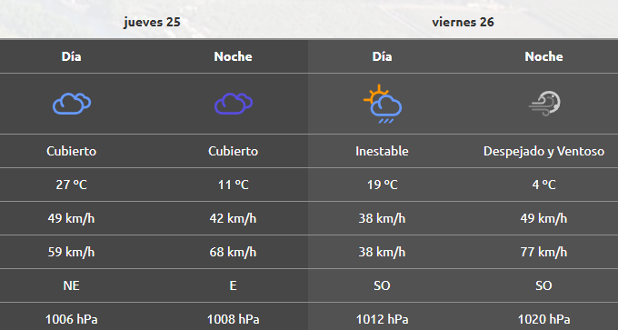 Para el viernes mientras tanto se esperan periodos de inestabilidad, con una máxima de casi 20°C y viento desde el sudoeste a casi 40 km/h.
