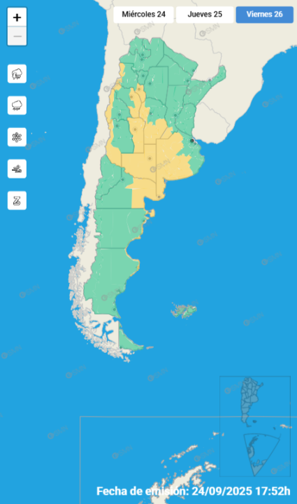 «Een las zonas de meseta se espera que los valores sean entre 10 y 20mm, pudiendo en ambos casos ser superados de forma puntual. No se descarta la precipitación en forma de lluvia y nieve mezclada en las zonas más altas«, detallaron desde el SMN.