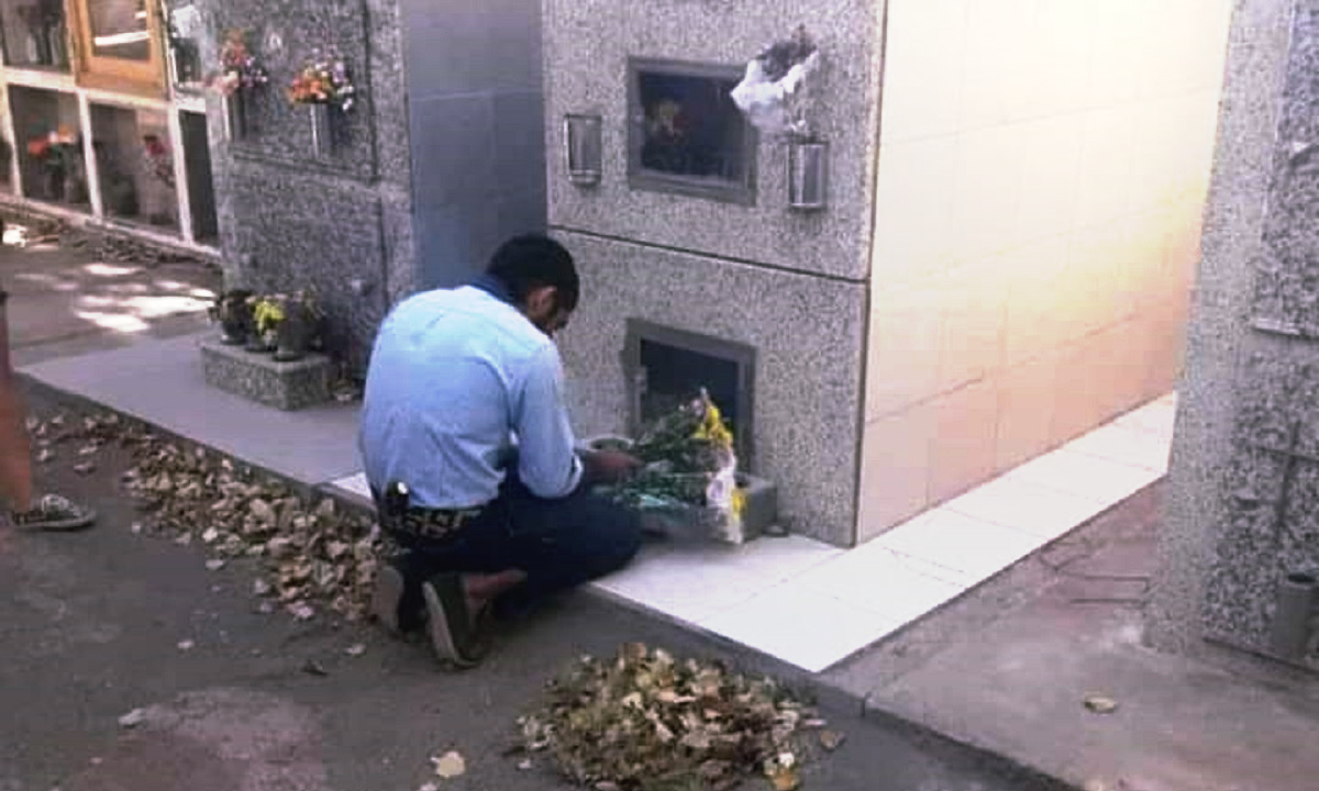 En las puertas del cementerio se encontró con su esposa, sus hijos, hermanos y su padre y juntos dejaron el ramo de flores que había prometido años atrás.