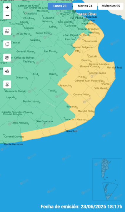 Según la última actualización, esa advertencia se trasladó ahora hacia el este abarcando a otras localidades balnearias bonaerenses como Necochea, Mar del Plata, Pinamar y la totalidad del partido de La Costa.