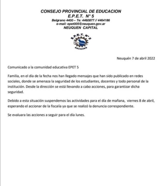 La EPET N°5 de Neuquén suspendió las clases para hoy debido a amenazas graves que circularon por redes sociales de forma anónima donde se atenta contra la seguridad de estudiantes, docentes y todo el personal de la institución.