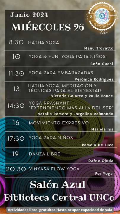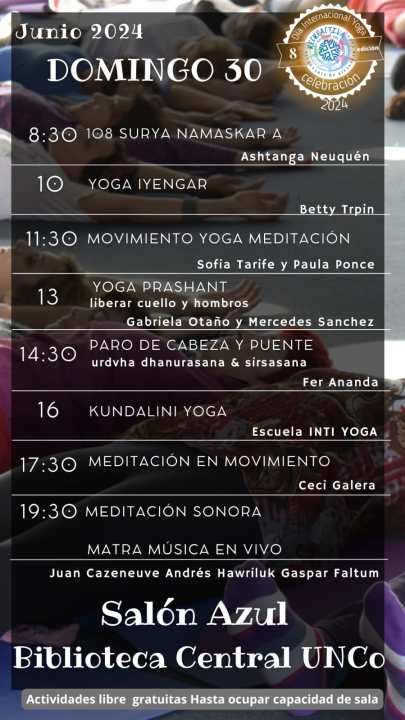 Desde 2015 se celebra en todo el mundo la existencia del Yoga el 21 de junio y la Universidad Nacional del Comahue (UNCo) es parte de los festejos. El festival de Yoga que se realiza en la UNCo llega a su octava edición y lo celebra con 5 días a puro Yoga. Como en cada ocasión, profesoras y profesores del Alto Valle participarán de actividades gratuitas y libres.