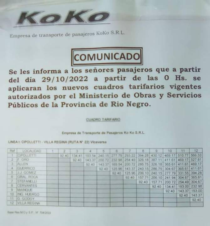 La empresa de transporte de pasajeros Koko, dependiente de Vía Bariloche, comenzó a hacer circular el comunicado que oficializa las nuevas tarifas que entrarán en vigencia a partir de este sábado 29 en los recorridos que van desde Cipolletti y hasta Villa Regina.
