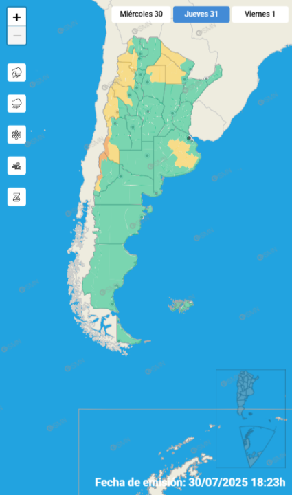 Junto a lo anterior, el organismo lanzó avisos por viento y viento zonda en prácticamente la totalidad de la cordillera argentina desde la región de Cuyo hasta las provincias de Salta y Jujuy. En los sectores afectados, las ráfagas serán capaces de alcanzar velocidades entre 50 y 75 km/h, con picos cercanos o superiores a los 100 km/h.