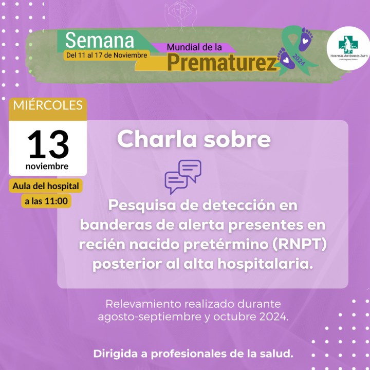 En Viedma, el Hospital “Artémides Zatti”, anticipó que ofrecerá este miércoles una charla con la kinesióloga Valeria Busso para la detección de «banderas de alerta» posteriores al alta, seguida el viernes por un encuentro al aire libre con las familias que se encuentran en esta etapa. A su vez se inaugurarán una serie de mejoras en la estética del espacio donde se brinda la atención. Lo acompañan en redes sociales con una campaña de concientización, abocada a sugerencias sobre “sueño seguro” y cuidados para favorecer una buena visión en los pequeños, una de las aristas a tener en cuenta cuando no se pudo completar el período de gestación.