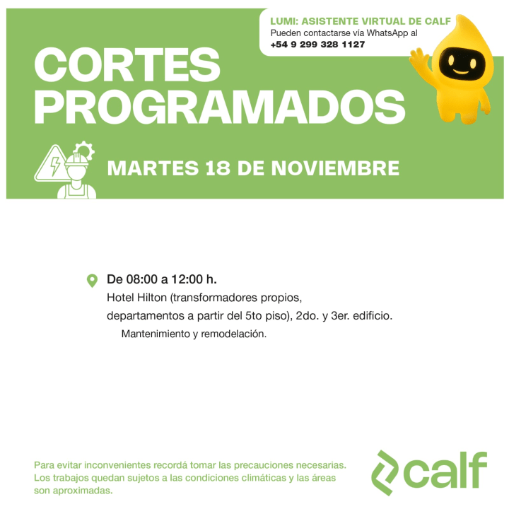 La Cooperativa de Agua, Luz y Fuerza de Neuquén (CALF) informó un corte de luz programado en la ciudad de Neuquén para este martes 18 de noviembre. Desde la cooperativa solicitan tener en cuenta los horarios para evitar cualquier inconveniente.