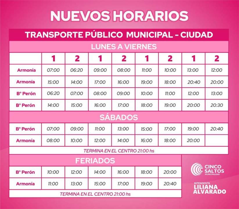 Los colectivos en Cinco Saltos realizan un recorrido que va desde el barrio La Armonía hasta el barrio Perón, pasando por el centro. El primer colectivo del circuito es a las 6.20 y el último 20.40. Los fines de semana y feriados la franja de circulación es reducida.