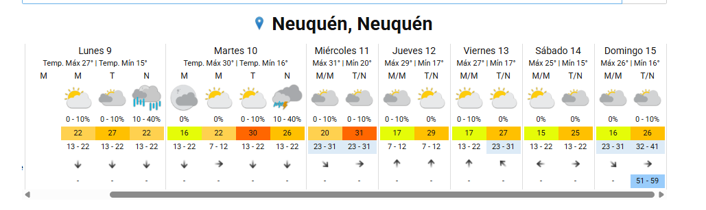 - Miércoles 11: el pico de calor. Será el día más caluroso de la semana con una máxima de 31°C. El viento del sector oeste cobrará fuerza (hasta 31 km/h) y la sensación térmica será elevada, especialmente durante la tarde.