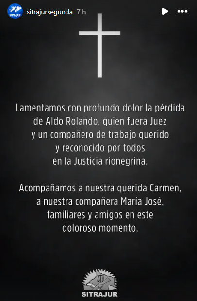 A través de sus redes sociales, la organización publicó un mensaje de despedida en el que destacó la trayectoria y el reconocimiento que tenía dentro del ámbito judicial. “Lamentamos con profundo dolor la pérdida de Aldo Rolando, quien fuera juez y un compañero de trabajo querido y reconocido por todos en la Justicia rionegrina”, señalaron.