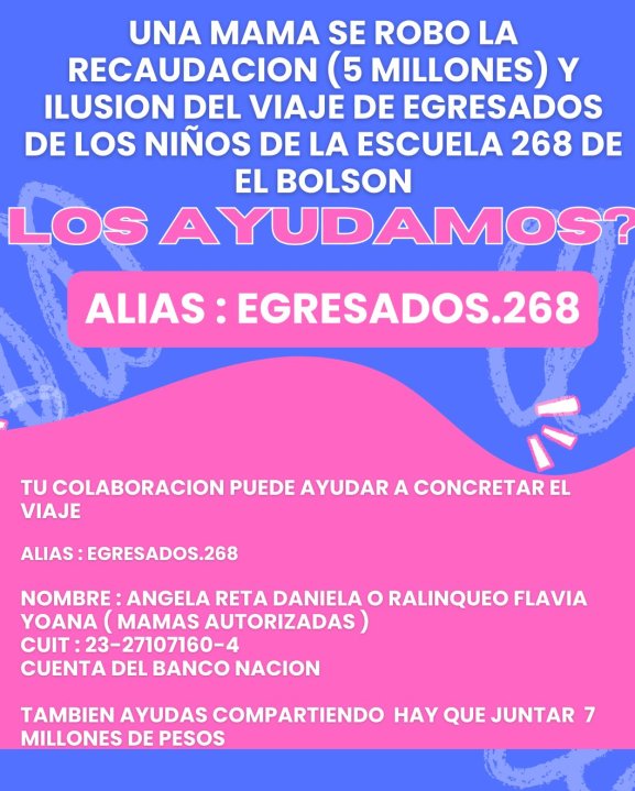 Para colaborar, se pueden enviar aportes al alias «egresados.268«, a nombre de Angela Reta Daniela o Ralinqueo Flavia Yoana (CUIT : 23-27107160-4). Es una cuenta de Banco Nación.