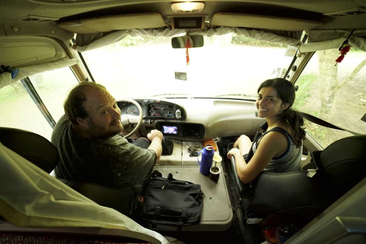 A donde vayan, los Fontana – Montero no pasan desapercibidos. Lentes de sol, charla, mates y risas, a veces solo contemplación. Viven a bordo de una Toyota Coaster modelo 1995, ploteada y llena de banderas que son como trofeos. Esas insignias cuentan historias, están cargadas de experiencias de miles y miles de kilómetros recorridos en un minibus, que es el hogar de una familia.