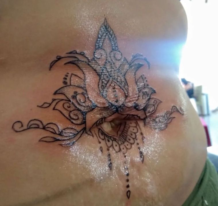 Romina se realizó una mandala alrededor de su ombligo luego de una cesárea por medio de la cual su ombligo se expandió. «Yo sentía mucha ansiedad, sabía que iba a doler, pero iba a ser gratificante tapar las estrías. Hay algunas mamás que las aman porque es un recuerdo de sus hijos, pero no es mi caso. Ahora tengo una hermosa mandala y sigo haciéndome lo que me gusta».