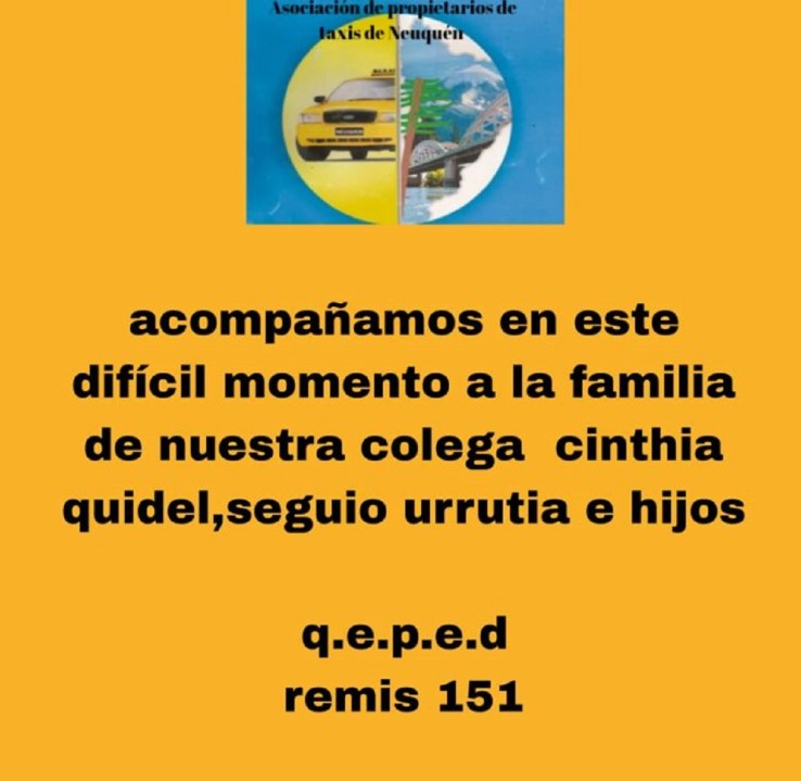 Se supo que Cintia Quidel era remisera y desde la Asociación de Propietarios de Taxis manifestaron «era muy conocida en el ambiente». Por esto, es que sus compañeros decidieron realizar una caravana que saldrá desde la sala velatoria de CALF en calle Bahía Blanca al cementerio.