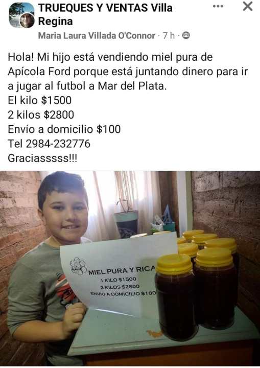 La vecina María Laura Villada O’Connor comenzó a publicar en grupos de compra y venta en Facebook una venta de miel «pura y rica» para ayudar a Bautista, su hijo, que está recaudando fondos para cubrir gastos de un viaje especial. La publicación fue compartida por miles de usuarios y el niño fue elogiado por el gran esfuerzo que hace para cumplir su objetivo.