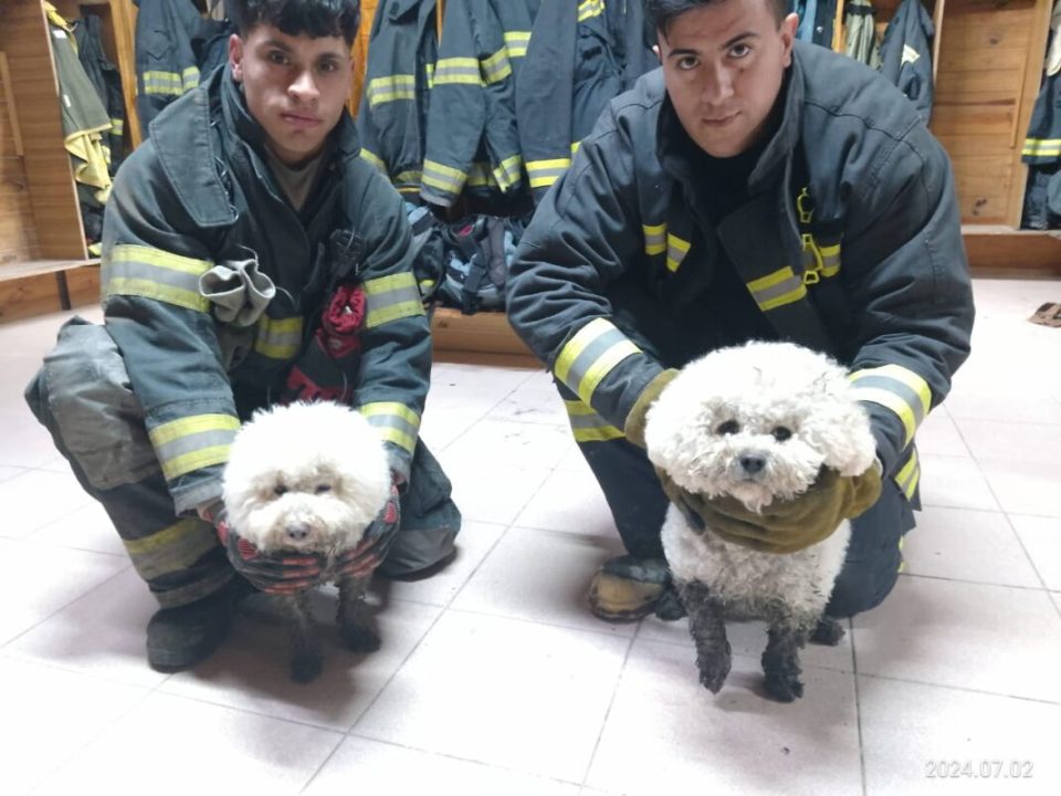 De inmediato, la dotación a cargo del comandante mayor Eduardo Solís llegó al lugar y con linternas lograron rescatar a los caniches que se encontraban en un desagüe «asustados y con principio de hipotermia».