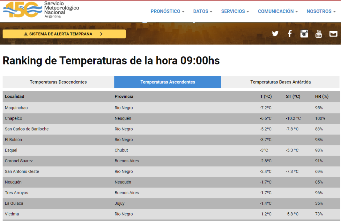 El Servicio Meteorológico Nacional (SMN) informó cuáles son las temperaturas en todo el territorio nacional, con un dato que indica una baja de la sensación térmica que pasó los 10 grados bajo cero y las ciudades de nuestra región fueron protagonistas. Cómo quedó el ranking y cuál fue la localidad más fría.