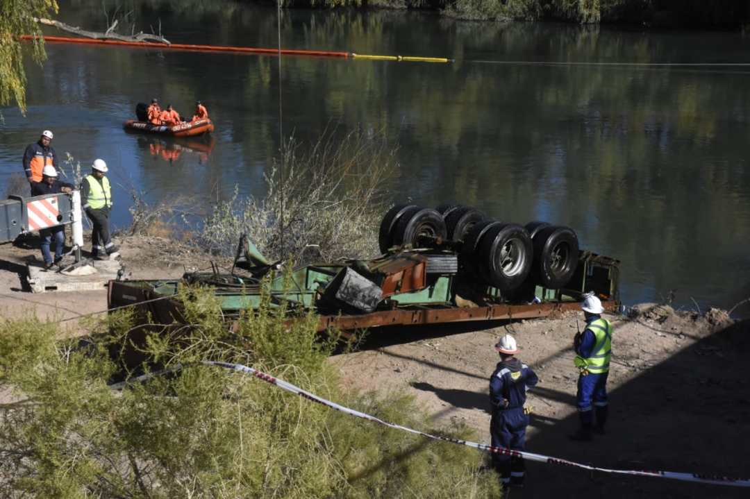 La extracción se realizó sobre el margen del río y fue por partes. La grúa retira primero el acoplado y luego la cabina. Estas piezas se llevarán hasta el borde del río y luego serán cargadas por una grúa arriba del camión.