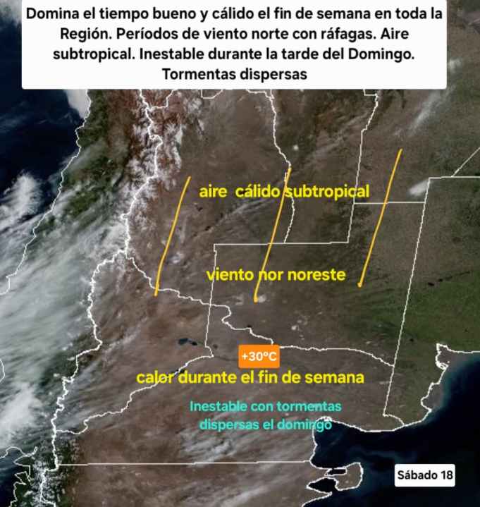 De todas maneras, indicaron que, en general: «Domina el tiempo bueno y cálido el fin de semana en toda la Región. Períodos de viento norte con ráfagas. Aire subtropical».