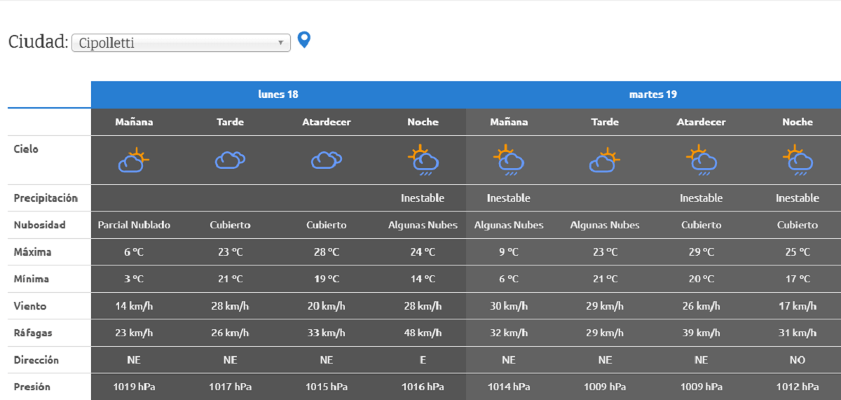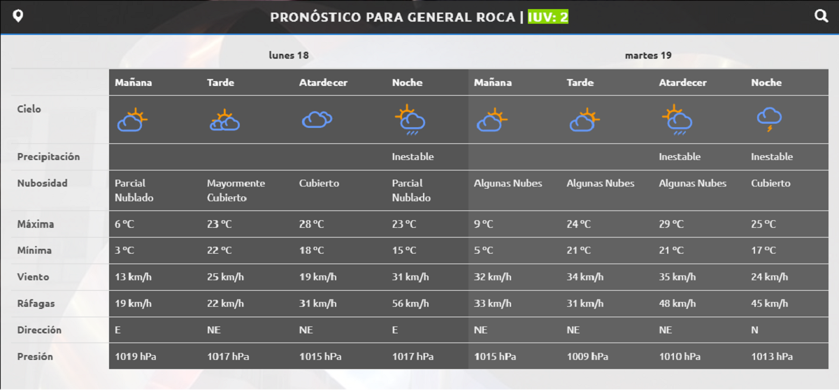En Roca y Cipolletti la AIC pronosticó un clima similar al de Neuquén, con probabilidad de lluvias este lunes 18 de noviembre por la noche.