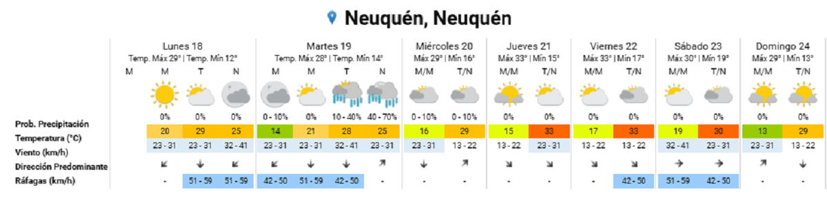 En su pronóstico extendido, la AIC anticipa una semana con temperaturas en aumento en el Alto Valle, con máximas de 28 grados para el lunes, 29 para el martes y miércoles y 32 para el jueves. El viernes se espera el día más caluroso con una máxima de 34 grados.