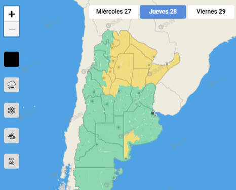 Las otras provincias en alerta son: Jujuy, Salta, Tucumán, Formosa, Chaco, Santiago del Estero, Santa Fe, Misiones, Corrientes, Córdoba, Catamarca, La Rioja y Buenos Aires.