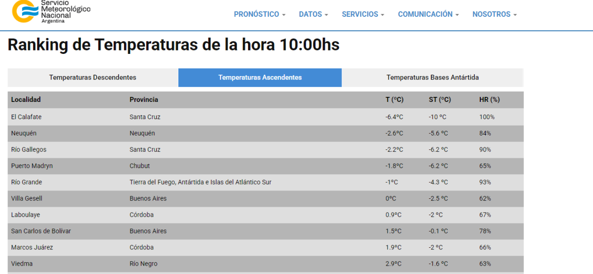 El ranking oficial de las ciudades más frías del país, publicado por el Servicio Meteorológico Nacional este miércoles, indica este orden: