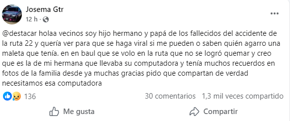 Tragedia en la Ruta 22: familiares piden colaboración para encontrar una valija con pertenencias
