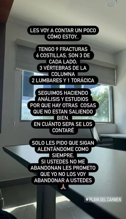 «Tengo nueve fracturas, seis de costillas, son tres de cada lado. Tres vértebras de la columna de la columna, dos lumbares y una torácica. Seguimos haciendo análisis y estudios porque hay otras cosas que no están saliendo bien. En cuánto sepa se los contaré», continuó con el relato el joven.