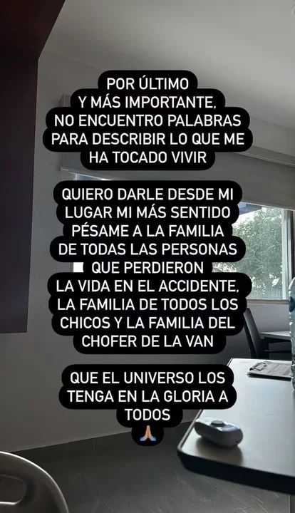 Además, envió sus condolencias a las familias de las víctimas: «Quiero darles desde mi lugar mi más sentido pésame a la familia de todas las personas que perdieron la vida en el accidente. La familia de todos los chicos y del chofer de la VAN. Que el universo los tenga en la gloria a todos».