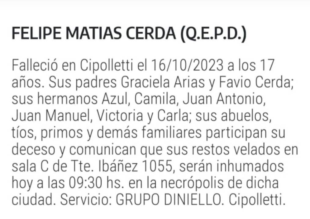 Según informaron las empresas de sepelio de Cipolletti, los jóvenes están siendo velados desde anoche por sus familias. El velorio de Felipe Cerda se realiza en Diniello, Teniente Ibañez 1055, en la Sala C y sus restos serán inhumados a partir de las 9.30 en el cementerio de la ciudad.